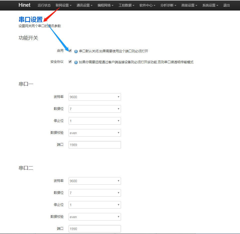 1. 如果是串口PLC,检查串口是否打开,以及串口的端口是否正确,进网关后台“通讯设置 - 串口设置”,勾选【启用】,串口一的端口为1989,串口二的端口为1990。