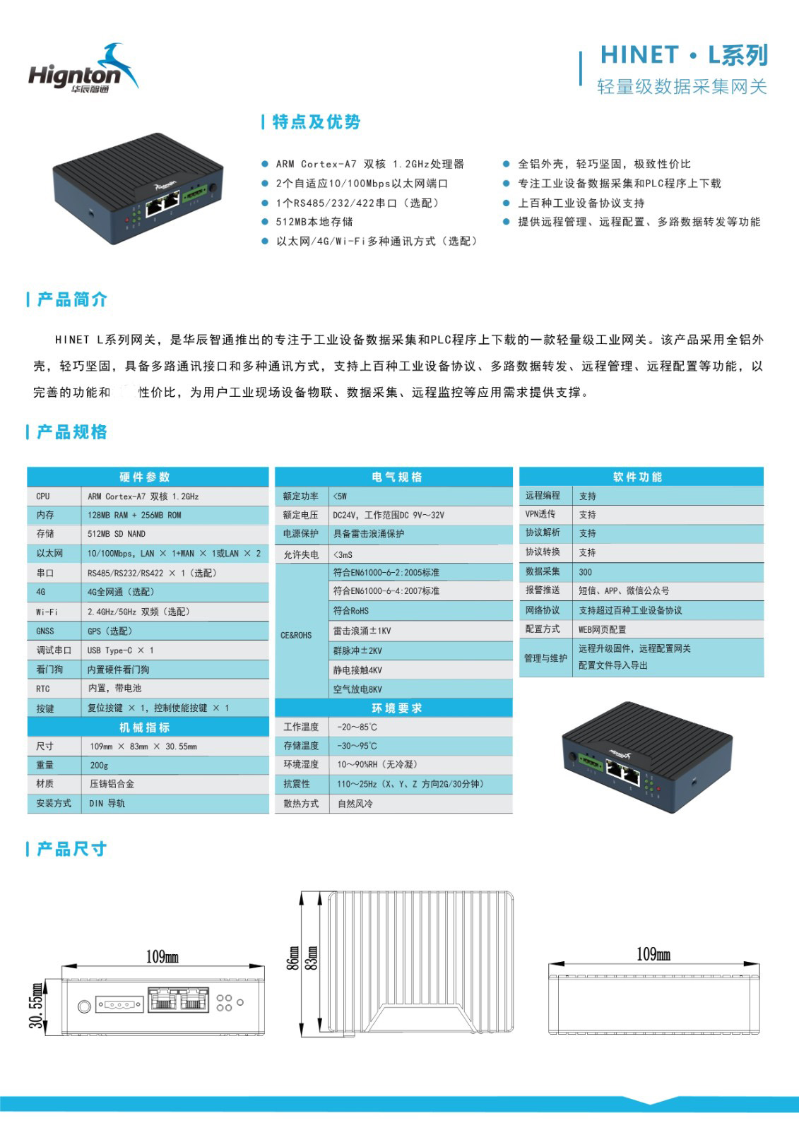 HINET L系列网关,是亿万先生MR智通推出的专注于工业设备数据采集和PLC程序上下载的一款轻量级工业网关。该产品采用全铝外 壳,轻巧坚固,具备多路通讯接口和多种通讯方式,支持上百种工业设备协议、多路数据转发、远程管理、远程配置等功能,以 完善的功能和性价比,为用户工业现场设备物联、数据采集、远程监控等应用需求给予支撑。