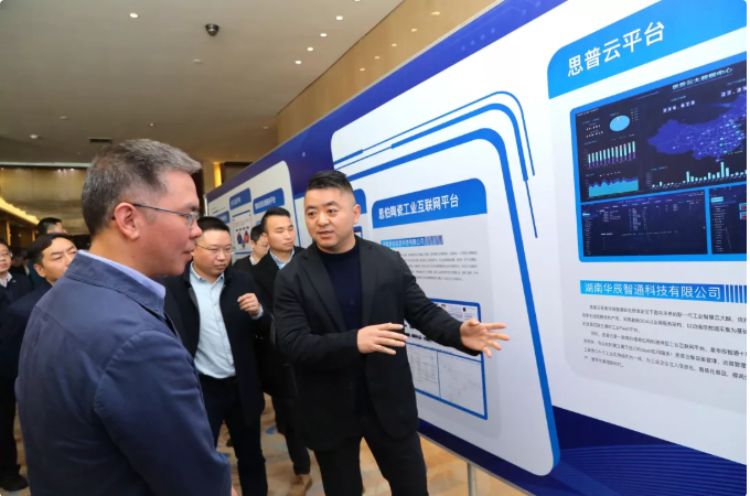• 亿万先生MR智通总经理傅帝向湖南省工业和信息化厅党组书记、厅长曹慧泉介绍思普云在工业领域应用情况